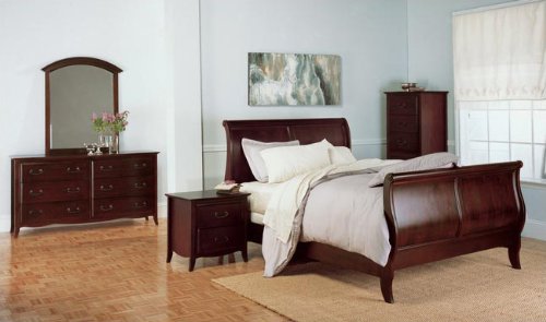 Modus Santa Barbara Platform Sleigh Bed Series Constructed of kiln dried Tropical Mindi wood, strength and longevity are ensured with this bedroom set. For an exotic, beautiful look to your bedroom, consider this bedroom set in rich sable finish. GeneralFeatures: -Set includes bed, nightstand, dresser and mirror-Available in Full, Queen, Eastern King, or California King sizes.-Santa Barbara collection.-Mindi wood-Six-step American finish comes in Sable color-Antiqued hardware-Constructed of solid kiln dried wood with no lamination, finger, or butt joints-Corner-blocked frames of chest, armoire, dresser and nightstand are made of solid wood.-Set includes slat pack, eliminating a need for boxspring-Solid wood drawer box withEnglish dovetailfront and back-Drawer box functions withfull extension ball bearingdrawer glides-Interior stainedto match exterior-Mattress / box spring combination (sold separately) should not exceed 12" H.-Linens, mattress, and box spring are not included.-1 year manufacturer's warranty on all manufacturing/material defects-Please Note: Optional Serta Mattress ships separately from bedroom furniture. Mattress purchase includes White Glove in-home delivery and set-up of mattress and may arrive for delivery on an earlier or later date than bedroom furniture.Specifications: -Full Dimensions: 50.5" H x 57" W x 84" L-Queen Dimensions: 50.5" H x 63" W x 89" L-California King Dimensions: 50.5" H x 75" W x 93" L-Eastern King Dimensions: 50.5" H x 79" W x 89" L-Sleigh Bed Dimensions: 50.5" H x 84" - 93" W x 57" - 79" D.-Mirror Dimensions: 46" H x 39" W x 2" D.-Nightstand Dimensions: 25" H x 25" W x 19" D.-Dresser Dimensions: 35" H x 66" W x 20" D.